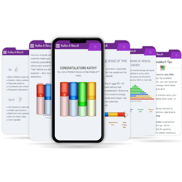 The Kolbe A Index is our flagship assessment. When you take the Kolbe A Index, you'll receive customized information based on your MO (method of operation), including: