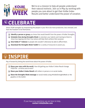 Pay it forward by letting the world know about the power of Kolbe use the hashtag #KolbeStrengthsWeek on your favorite social media platforms.